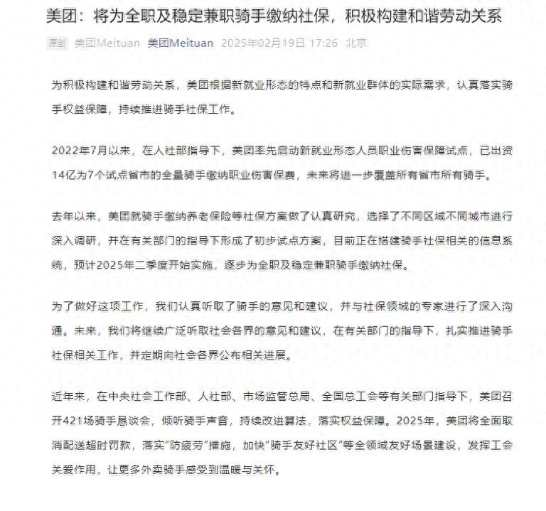 2月19日下午,“美团Meituan”微信账号发文表示,正在搭建骑手社保相关的信息系统,预计自2025年第二季度开始实施,逐步为全职及稳定兼职骑手缴纳社保。